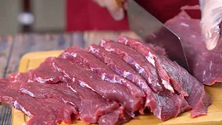 Bạn dùng dao sắc thái thịt bò thành những miếng to, dày khoảng 0.5 – 0.7cm là được. Lưu ý, trong cách làm khô bò miếng này bạn cần thái bò theo thớ dọc để thành phẩm đẹp mắt, khi xé bò thành sợi và thưởng thức bò không bị vụn.