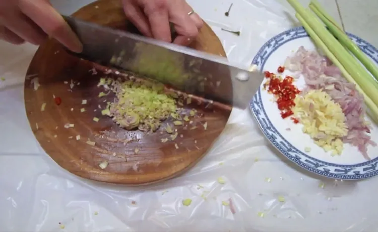 Sả bỏ gốc, rửa sạch rồi băm thật nhuyễn. Hành tím và tỏi cũng đem lột vỏ, băm nguyễn. Gừng bạn cũng đem cạo vỏ, băm nhuyễn. Để tiết kiệm thời gian, bạn có thể cho các nguyên liệu này vào máy xay đa năng để xay nhuyễn.