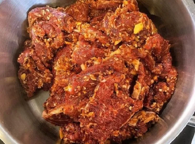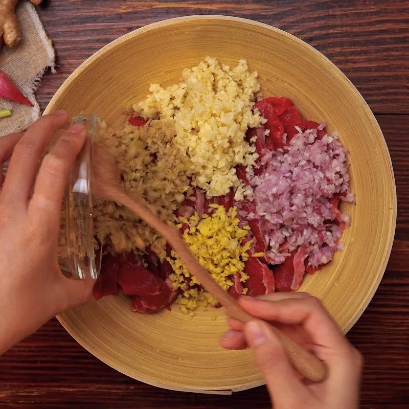Công đoạn tiếp theo trong cách làm khô bò khá quan trọng, đó là tẩm ướp gia vị cho thịt bò. Bạn đem thịt bò ướp với gia vị bao gồm: 2 muỗng canh hạt nêm, 2 muỗng đường, 1 muỗng nước mắm, 1 muỗng dầu ăn, 2 muỗng dầu hào, 2 muỗng ớt bột và toàn bộ phần hành, tỏi, sả, gừng băm.