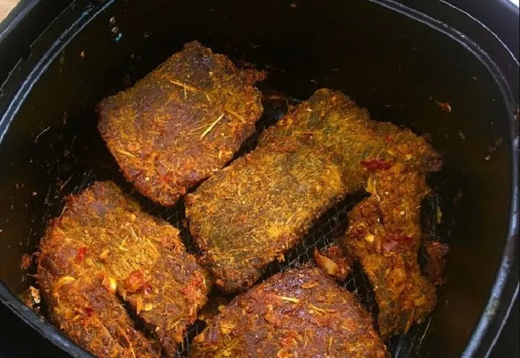 Làm nóng nồi chiên không dầu trong khoảng 3 – 5 phút. Bạn xếp thịt vào khay chiên sao cho các miếng không xếp chồng lên nhau, điều chỉnh nhiệt độ 140 độ C và sấy thịt trong 40 phút. Lưu ý trở mặt thịt trong quá trình sấy để miếng thịt chín, khô đều.