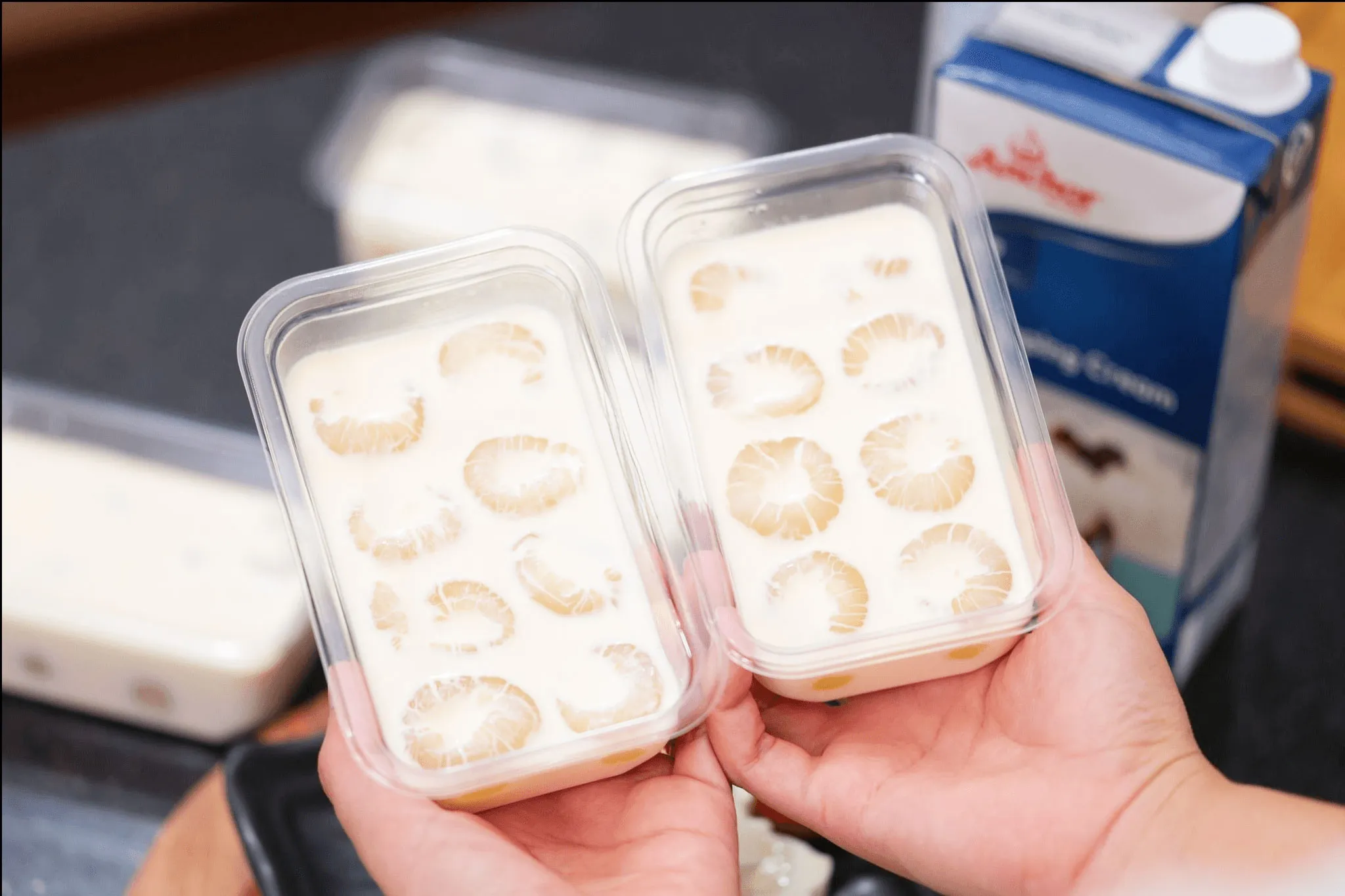 Đậy kín hộp và cho vào ngăn mát tủ lạnh trong khoảng 4–6 tiếng để hỗn hợp đông lại hoàn toàn. Sau thời gian làm lạnh, bạn sẽ có phần khúc bạch vải mềm mịn, thanh mát, thơm ngọt và đẹp mắt.