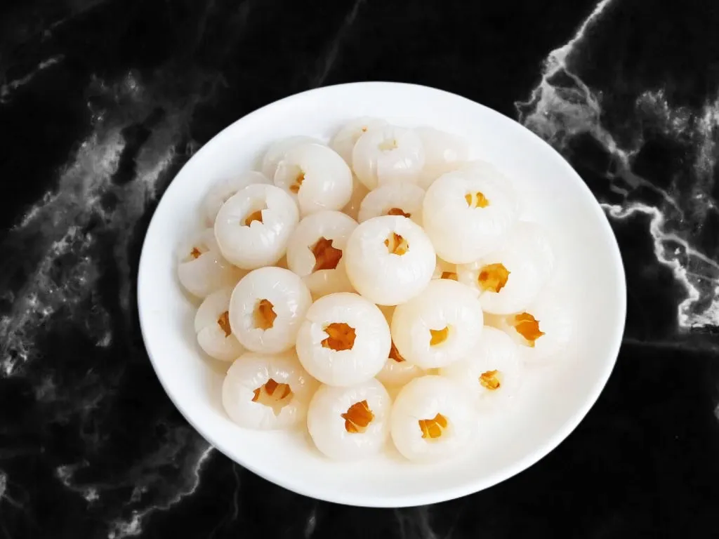 Nếu dùng vải tươi, hãy bóc vỏ, bỏ hạt và để nguyên quả hoặc cắt đôi tùy sở thích. Vải nên chọn loại chín vừa, mọng nước và thơm ngọt. Nếu sử dụng vải hộp, hãy vớt ra rổ và để ráo nước hoàn toàn. Việc để ráo sẽ giúp món khúc bạch không bị tách nước hoặc nhão trong quá trình bảo quản.
